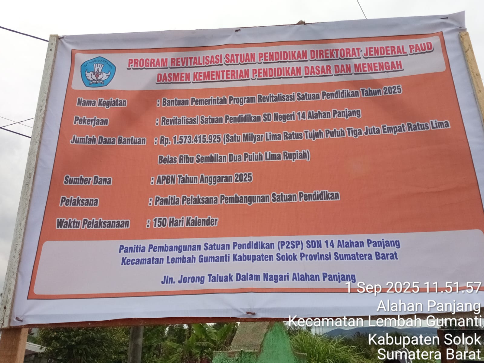 Berdasarkan plang proyek, kegiatan ini merupakan Bantuan Pemerintah Program Revitalisasi Satuan Pendidikan Tahun 2025 dengan nilai fantastis: Rp1.573.415.925, bersumber dari APBN melalui Ditjen PAUD-DASMEN, Kementerian Pendidikan Dasar dan Menengah. Proyek direncanakan selesai dalam 150 hari kalender dengan pelaksana panitia pembangunan yang ditetapkan lewat SK Kepala Sekolah Windra Nelly, S.Pd pada 16 Juni 2025.