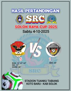 Solok — SRC. Laga Sabtu sore (4/10/2025) di Stadion Tuanku Tabiang, Koto Baru kembali memanas dalam lanjutan Solok Raya Cup (SRC) 2025. Pertandingan mempertemukan Leader FC dan Cupak Legend FC, dua tim yang sama-sama tampil dengan motivasi tinggi untuk merebut tiket semifinal. Namun, performa luar biasa dari Leader FC membuat laga sepenuhnya dikuasai oleh mereka, menutup pertandingan dengan skor telak 5–1.